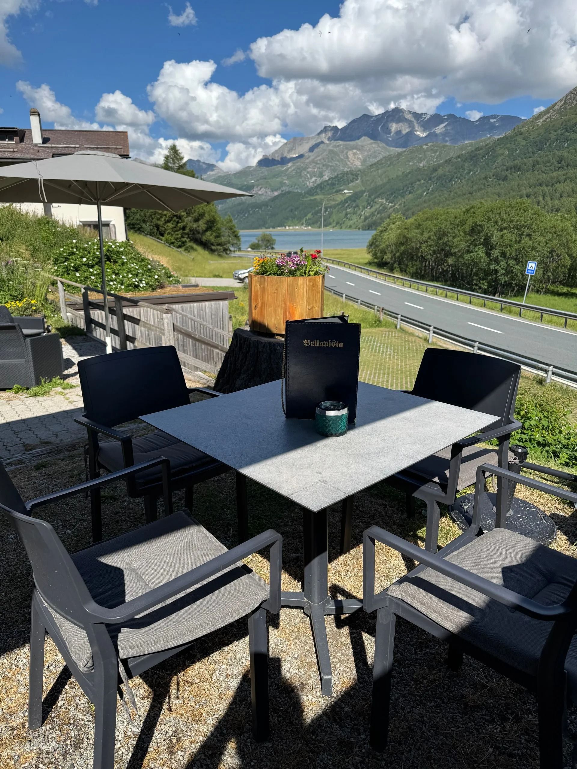 Unsere Sonnenterrasse ist ein Highlight im Sommer: Hier treffen sich Wanderer, Velofahrer, Familien und Genießer zum gemeinsamen Verweilen. Ob Mittagessen in der Sonne oder romantisches Dinner im Abendlicht – den fantastischen Ausblick auf den Piz da la Margna macht jeden Besuch besonders.